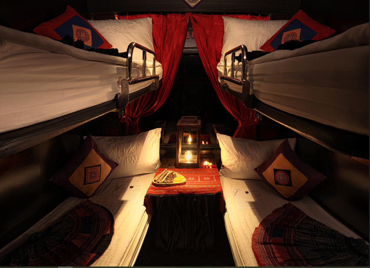Tiện nghi: Cabin 4 giường ốp gỗ, điều hoà, đèn đọc sách, khăn lạnh, nước uống, 2 WC cuối toa